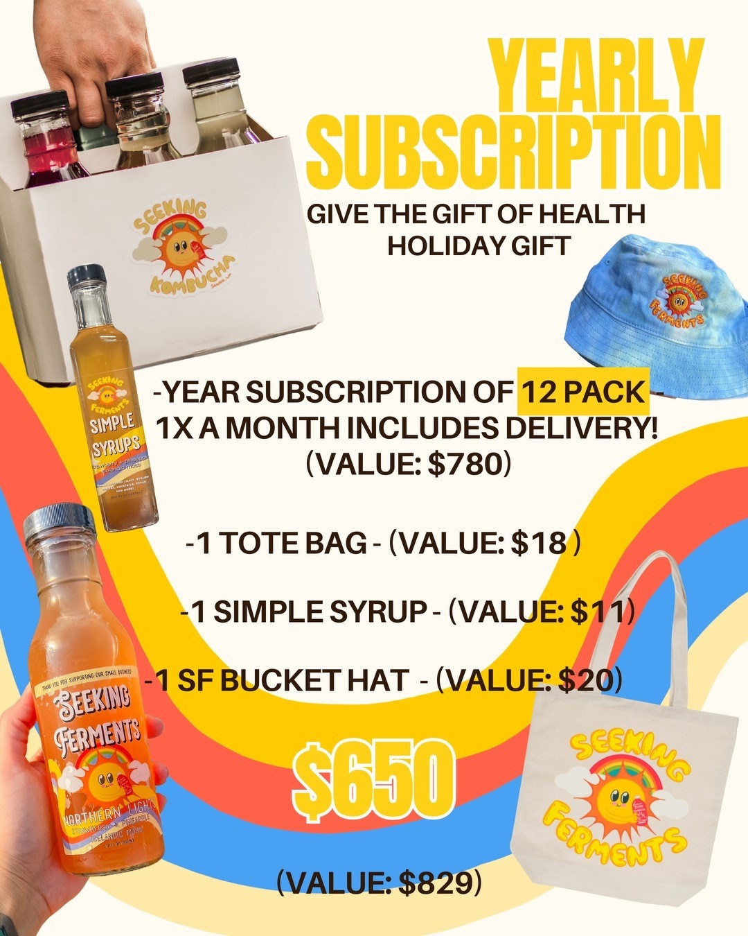 Experience the full potential of fermented beverages with our deluxe yearly subscription! Perfect for families, offices, or true kombucha enthusiasts, this plan delivers 12 bottles of refreshing kombucha every month. Share the joy or savor it all yourself!