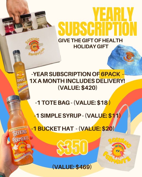 •1 Full year Monthly Delivery of 6 Kombucha Bottles: Packed with probiotics and bold flavor. (Value: $420)